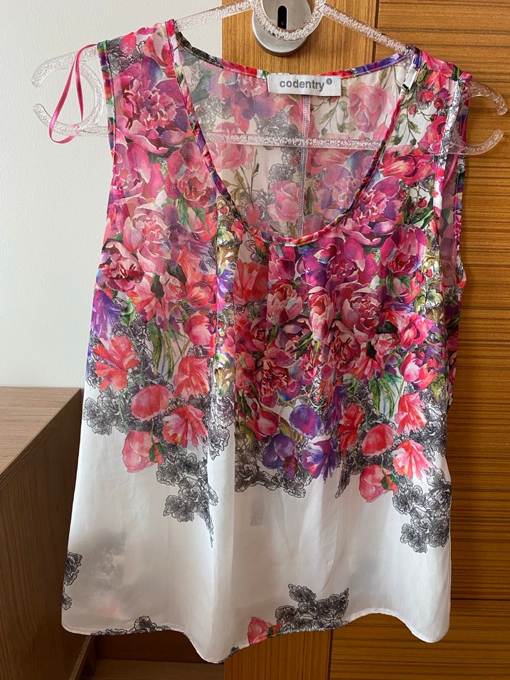 Pembe çiçek desenli, dantel detaylı, V yaka, kolsuz, normal boy midi uzunluğunda bohem tarzda bol kesim bluz.