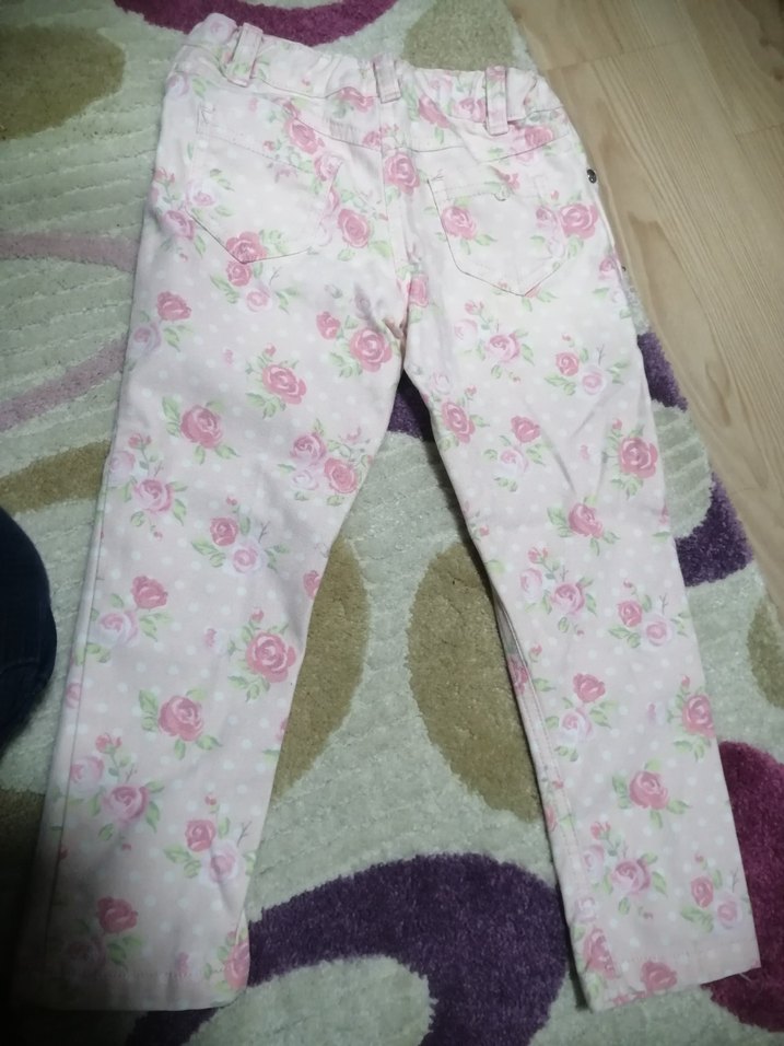 Dantel detaylı, pembe pastel çiçek desenli, sentetik kumaştan yapılmış kız pantolonu. Rahat ve şık bir günlük stil için uygundur sorunsuzdur boy 57 en 26cm 3-4 yaş