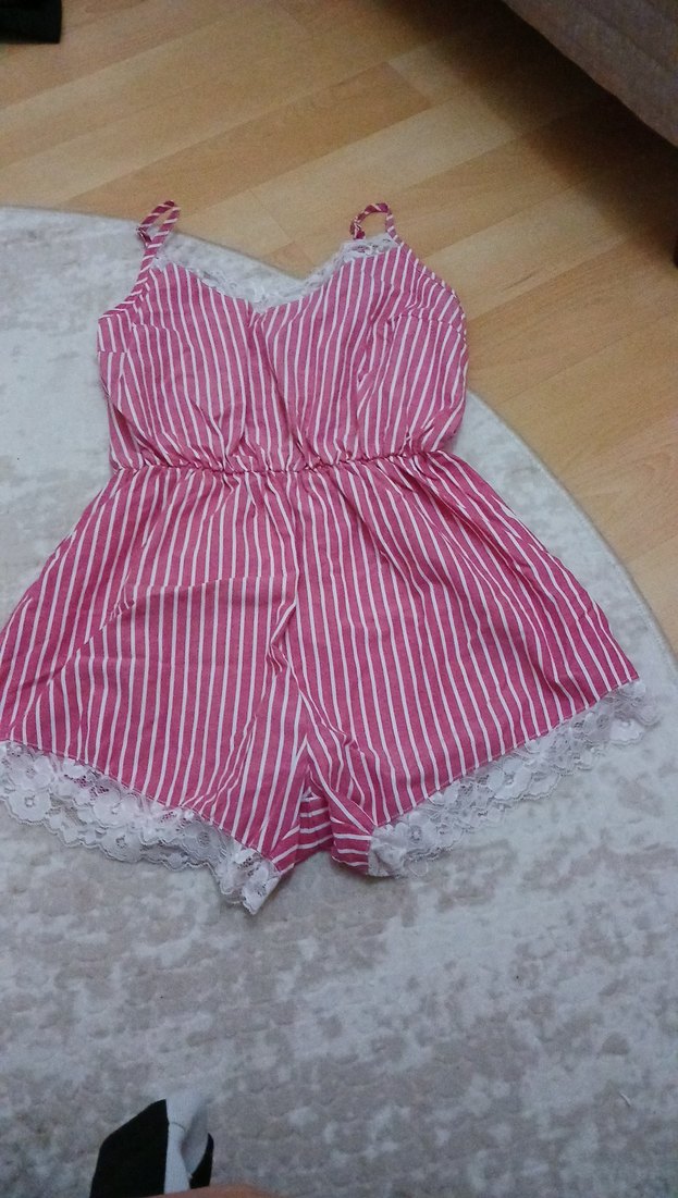 Renkli pembe çizgili kadin tulumu, ince askılı ve dantel detaylı, rahat bir kullanım sunar.
