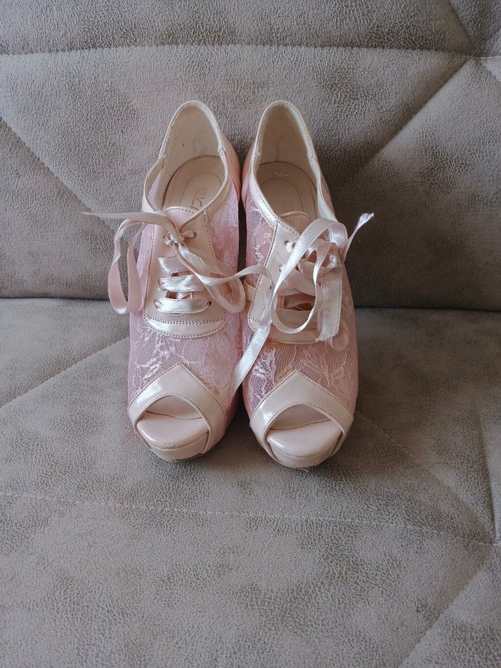 Pembe renkte, dantel ve nakış detaylı dolgu topuklu abiye ayakkabı. Klasik vintage stilinde, düğünler için uygun. iki kez kullanılmıştır tüm detayları fotoğraflar da mevcuttur