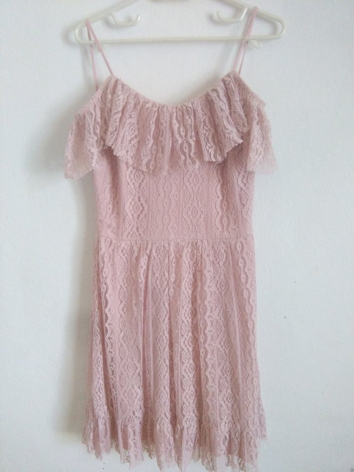 Açık pembe dantel kumaştan,omuz detaylı, askılı ve omuzları açık tasarımlı, vintage bohem tarzda, parti için uygun elbise, marka temsilidir.
