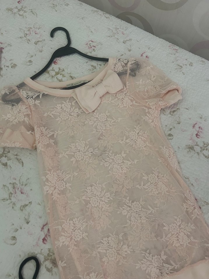 Dantel detaylı, kısa kollu, bisiklet yaka ve midi boyda, pastel pembe tonlarında vintage tarzda hamile bluzu. Günlük kullanıma uygun, bohem havası vardır.