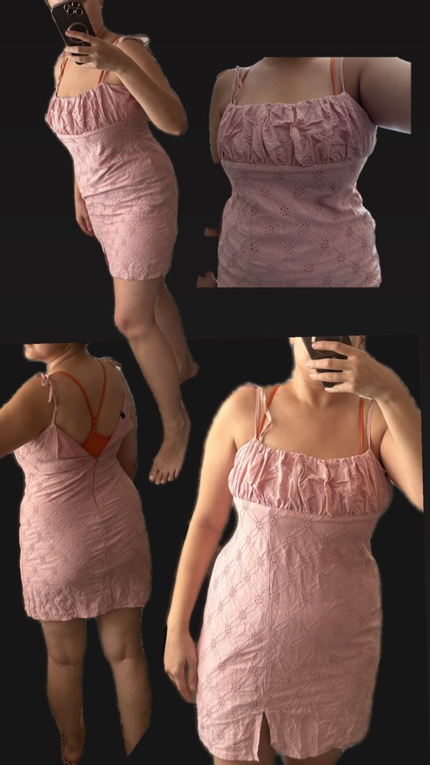 Yumuşak keten kumaştan yapılmış, ince askılı, dantel detaylı pembe straplez mini elbise. Midi boyu ve pastel tonu romantik akşamlar için uygundur.