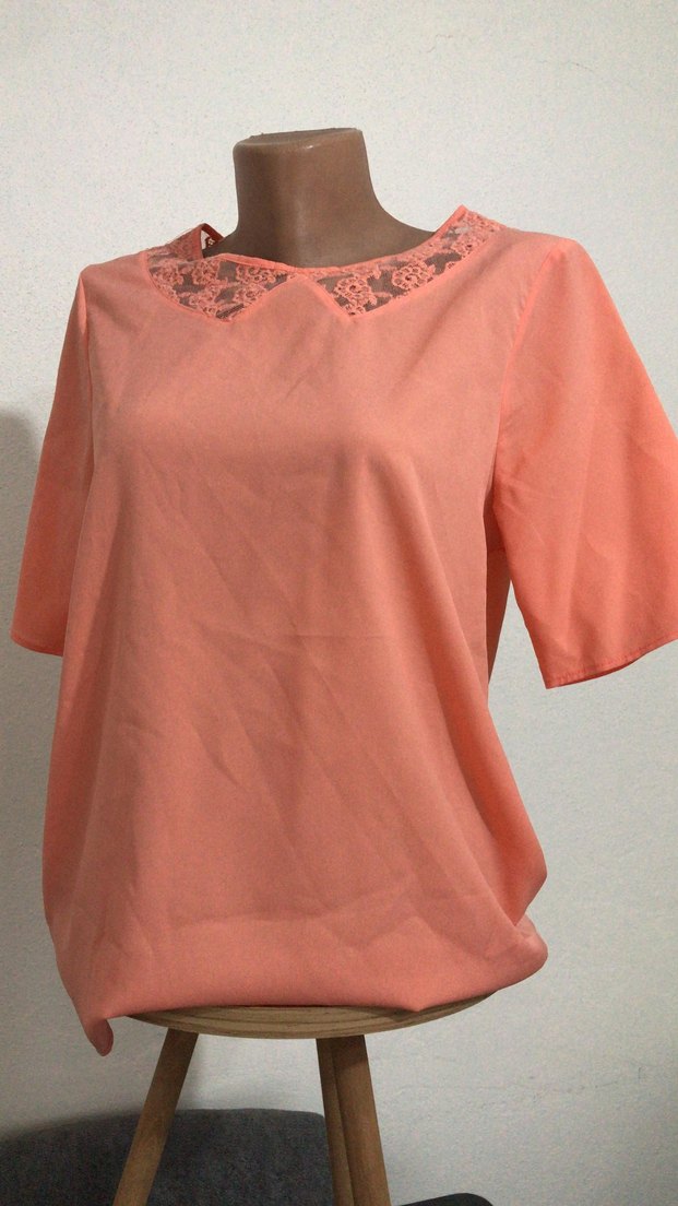 Dantel detaylı, yuvarlak yaka ve kısa kollu pembe kadın bluz, bol kesim ve ipeksi kumaştan, günlük kullanım için uygundur.
