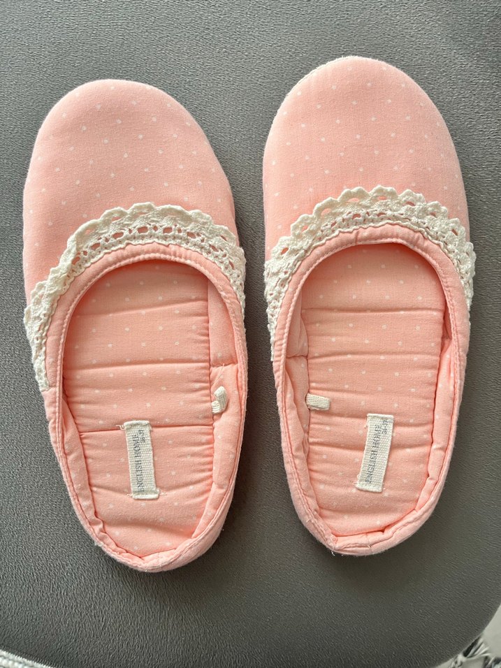 Pastel pembe renkte, dantel detaylı ve nakış desenli kadın ev terliği. Yumuşak kauçuk malzemeden, konforlu dolgu topuklu, günlük kullanıma uygun.