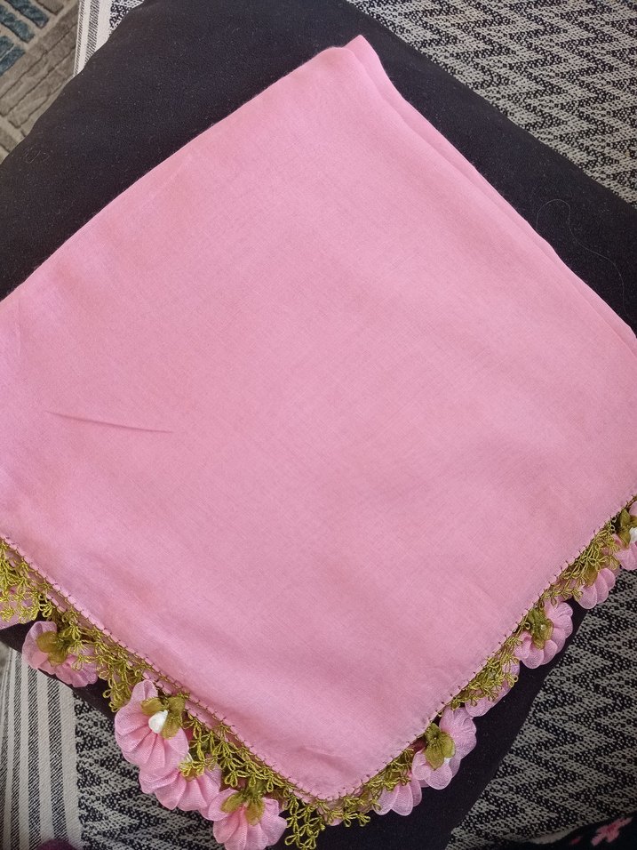Pastel pembe renkte, dantel ve çiçek detaylı tekstil kumaştan kadın fular, vintage bohem tarzını yansıtıyor.