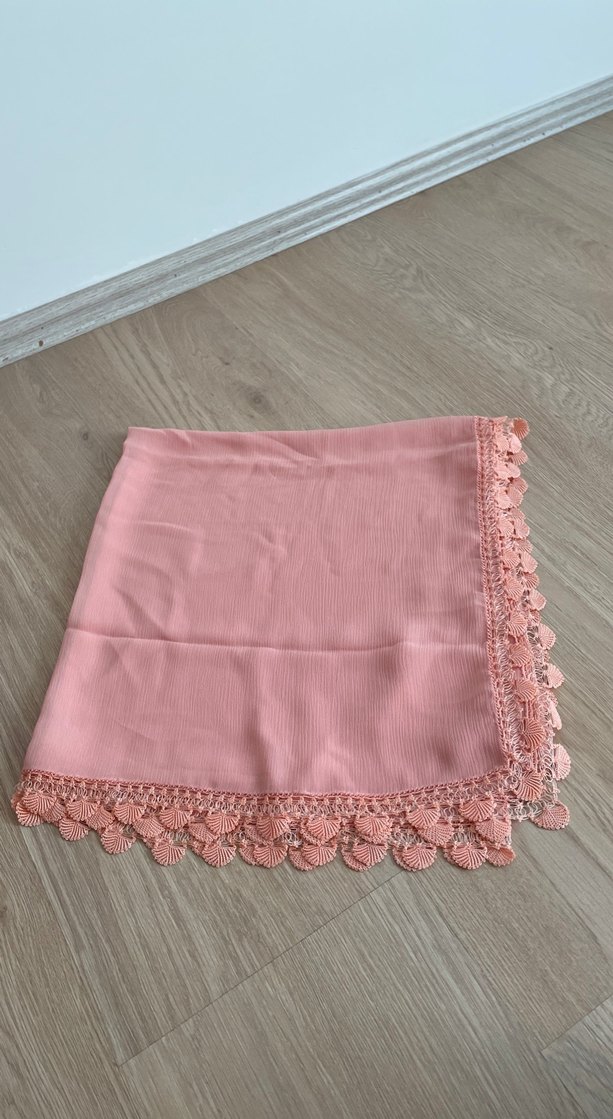 Pastel pembe renkte, dantel detaylı, yumuşak sentetik kumaştan bohem tarzda kadın fular.