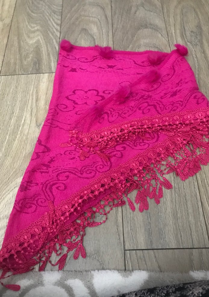 Pembe renkte, dantel detaylı ve ipeksi dokulu kadın fular, renkli bohem ve retro tarzı yansıtıyor.