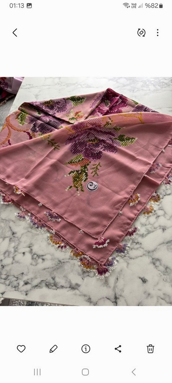Pastel pembe renkli, dantel kenarlı ve çiçek desenli kadın igne oyasi yazma. Bohem ve retro tarzı yansıtır.