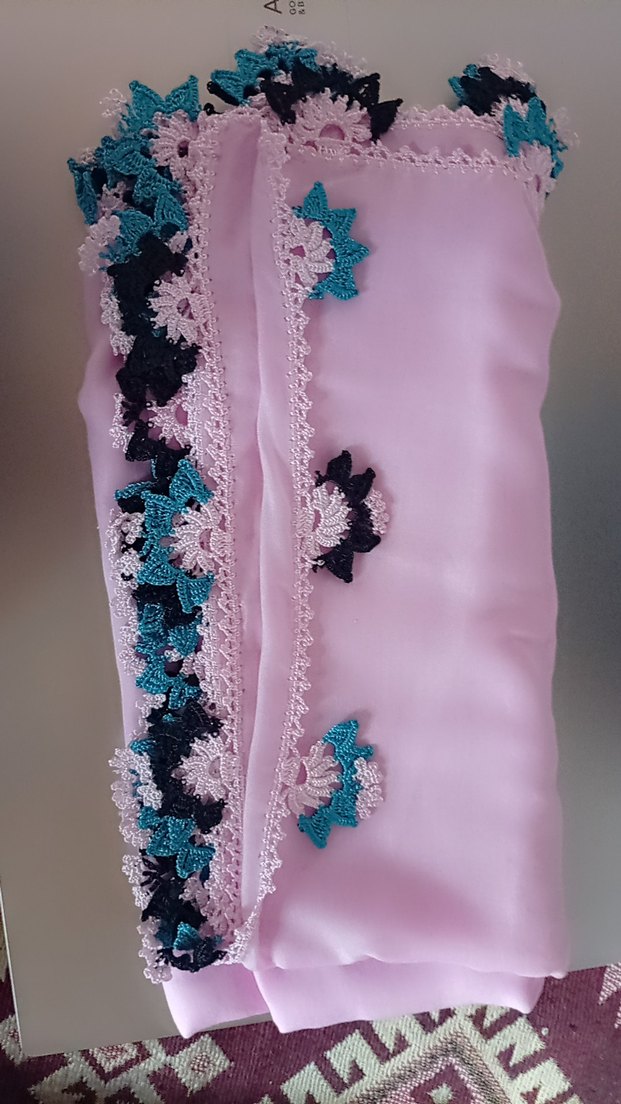 Yumuşak sentetik kumaştan yapılmış, pastel tonlarda mavi ve siyah dantel detaylı pembe kadın şalı. Bohem ve şık tarzlar için uygundur.