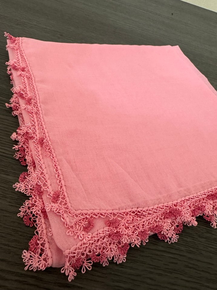 Pembe renkte, dantel kenarlı, yumuşak dokulu kadın şalı, rahat ve klasik bir stile sahiptir.