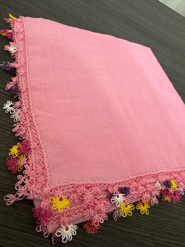 Pembe renkli kadın şalı, yumuşak tekstil kumaştan üretilmiş ve çok renkli çiçek desenli narin dantel kenarlara sahiptir. Pastel tonu bohem tarzına uygundur.