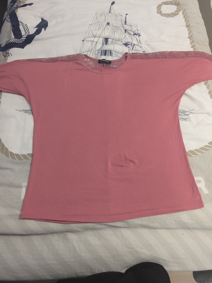 Pastel pembe renkli, kısa kollu, yuvarlak yakalı ve bol kesim kadın tişörtü. Omuzlarda dantel detayları ve midi boy uzunluğu ile günlük rahat kullanıma uygun.