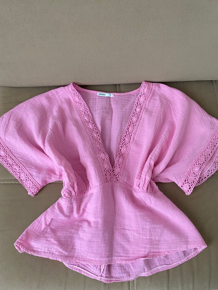 V yaka, kısa kollu, dantel detaylı pembe keten bluz. Nakışlı ve kısa boylu, bohem stil için uygun.