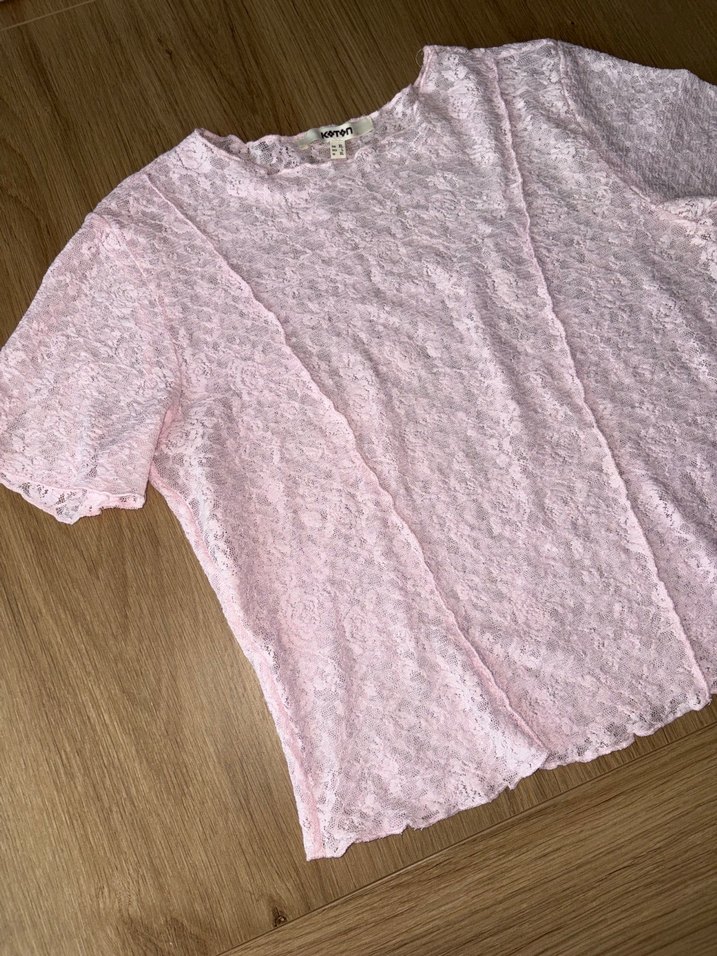 Pastel pembe renkte, keten kumaştan yapılmış, dantel detaylı, kısa kollu ve salaş kesim kadın bluz.