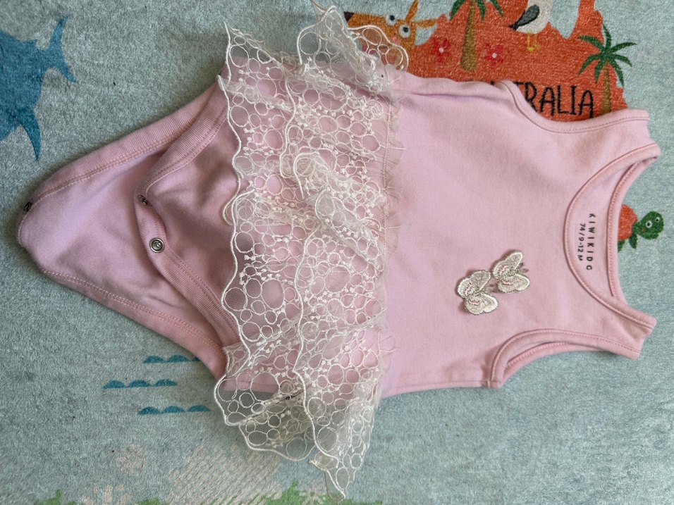 Askısız yakalı, dantel detaylı ve nakışlı desenlere sahip pastel pembe kız bebek body. Ürün kullanılmamıştır. 9-12 ay