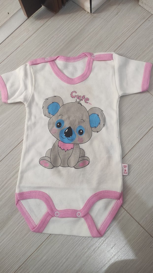 Yuvarlak yaka, kısa kollu kız bebek body. Pastel pembe kenarları, sevimli koala baskı 18-24 ay