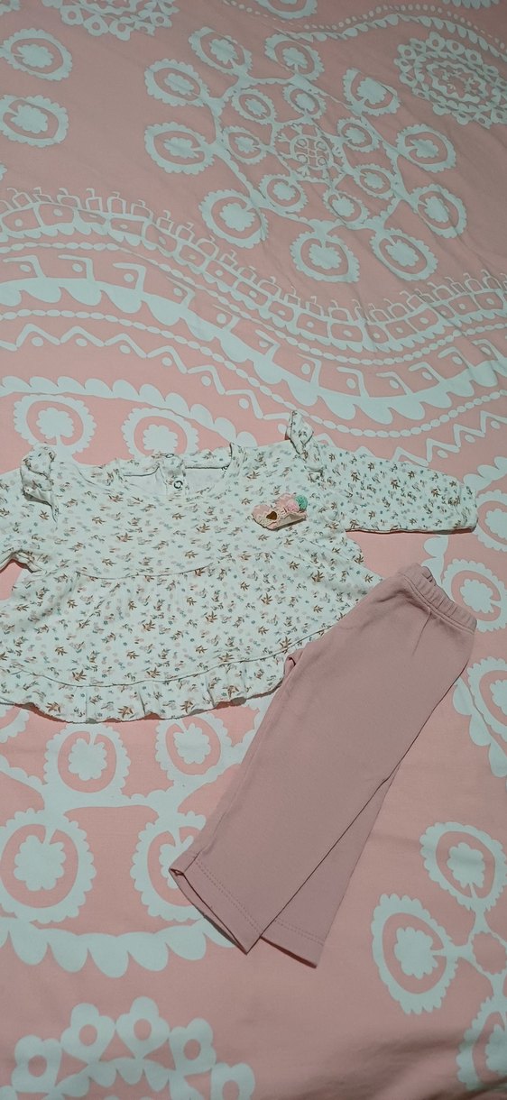 Dantel detaylı, uzun kollu desenli üst ve yumuşak pembe pantolondan oluşan pastel renkli kız bebek takımı.