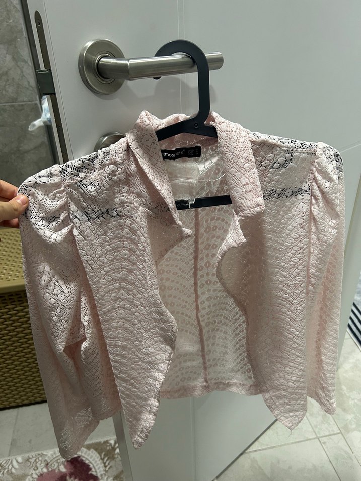 Dantel desenli, pembe renkli, uzun kollu ve yakalı, vücuda oturan bolero s beden