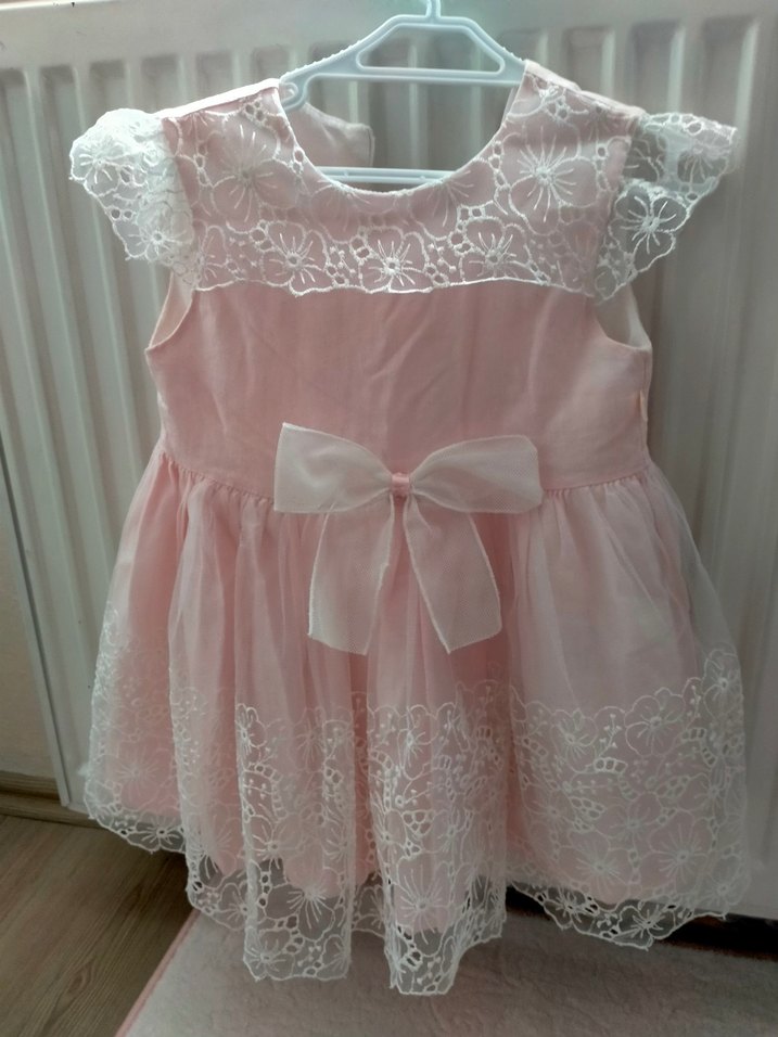 Pembe renkli kız çocuk elbisesi, dantel detayları ve nakışlı desenleriyle klasik ve şık bir görünüm sunar. Belinde fiyonk bulunur. elbisenin alt kısmı 4 kat dikilmiş giyildiginde kabarık duruyor herhangi bir özür yoktur.
