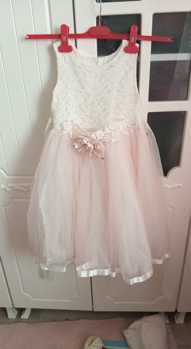 Dantel işlemeli üst kısmı ve çiçek detaylı beliyle pembe, kolsuz kız çocuk elbisesi. Yumuşak ve hafif kumaştan etek, saten kenarlı.