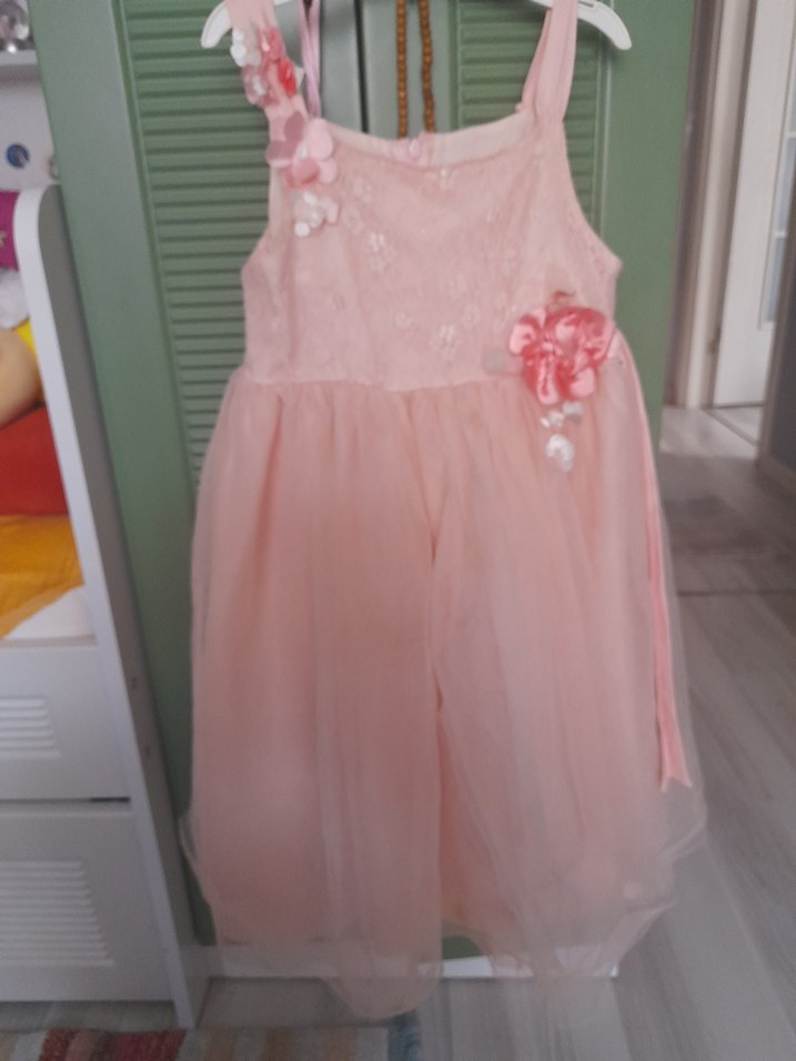 Dantel ve nakış detaylı, askısız ve bol kesim pembe kız çocuk elbisesi, belden baglamali arkadan fermuarlı