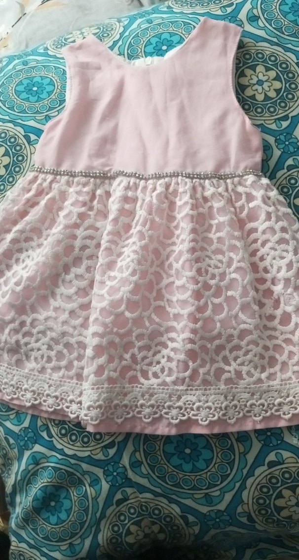 İnce askılı, dantel işlemeli ve boncuk detaylı bel kısmıyla süslenmiş pembe kız çocuk elbisesi.