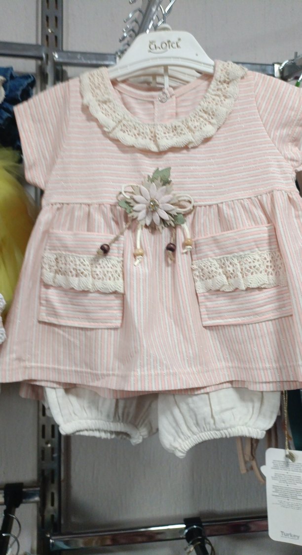 Dantel detaylı, kısa kollu, salaş kesim pembe kız çocuk elbisesi. İşlemeli desen ve tekne yaka bulunur. Beyaz şort ile birlikte.