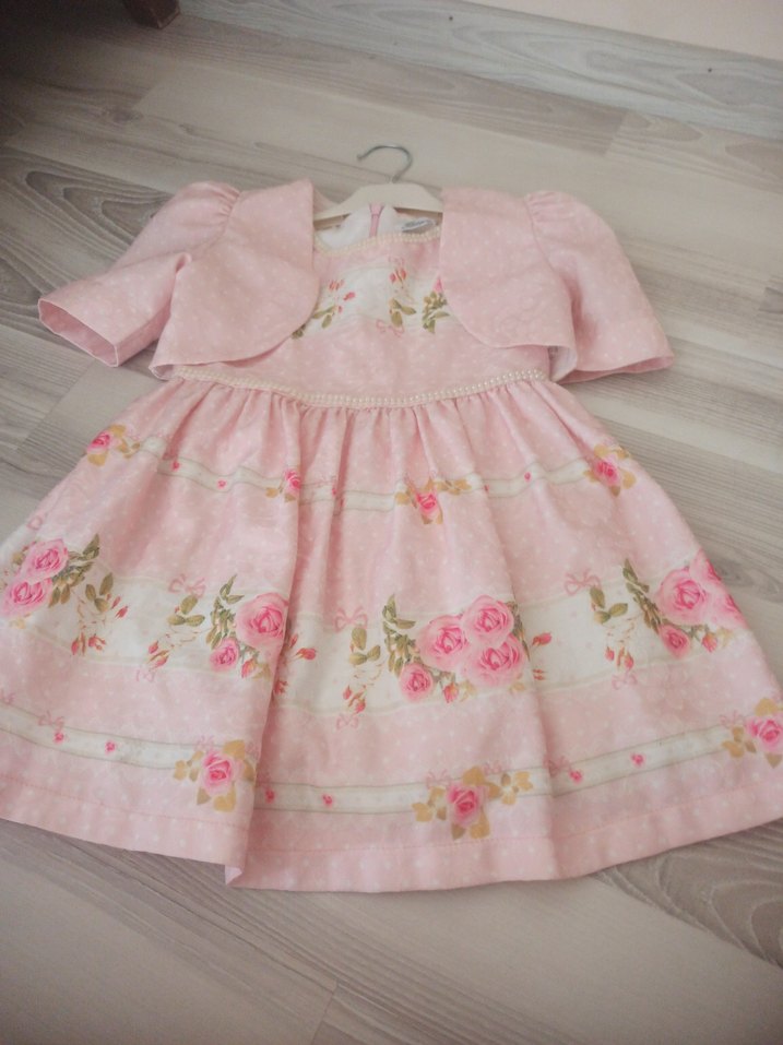 Çiçek desenli ve dantel detaylı pastel pembe kız çocuk elbisesi. Kolsuz, straplez kesim ve bol kalıpla modern klasik tarzda. ✨