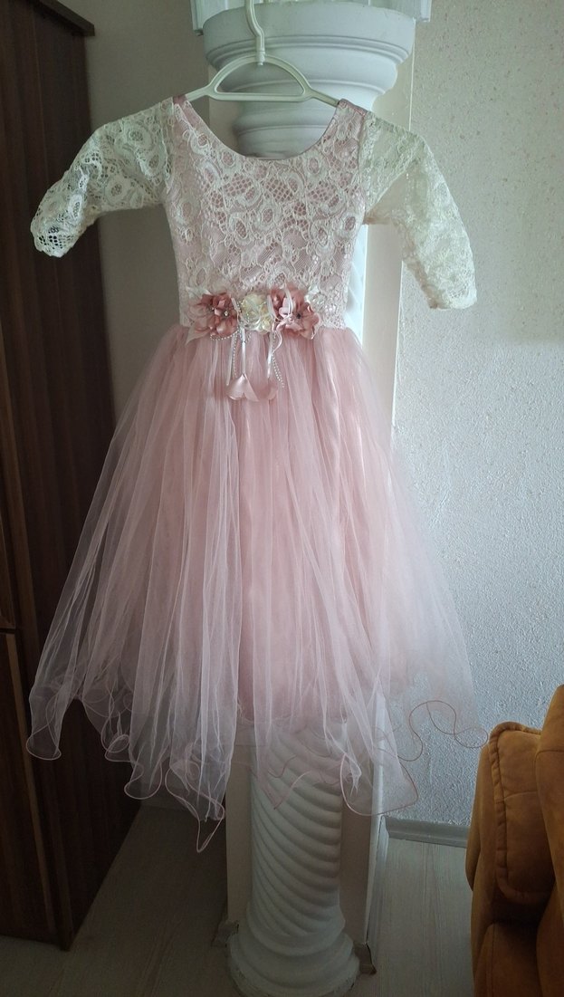 Dantel detaylı, triko üst kısmı ve pastel pembe tül etekli kız çocuk elbisesi. Straplez yakalı ve nakışlı, bohem tarzda.