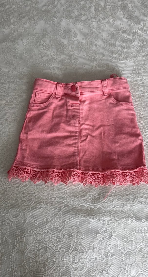 Dantel detaylı, işlemeli pastel pembe kız çocuk kot etek, rahat ve şık bir görünüme sahiptir.