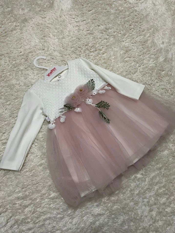 Kız çocuklar için uzun kollu, yuvarlak yaka, yumuşak triko kumaştan yapılmış elbise. Pastel pembe işleme ve dantel detaylı, tül etekli, modern klasik tarzda rahat kesim.