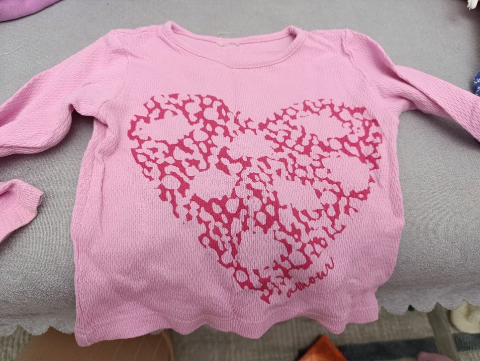 Takımdır. Dantel detaylı, baskılı kalp desenli, pastel pembe renkli, uzun kollu, bisiklet yaka, dar kesim kız çocuk tişörtü.