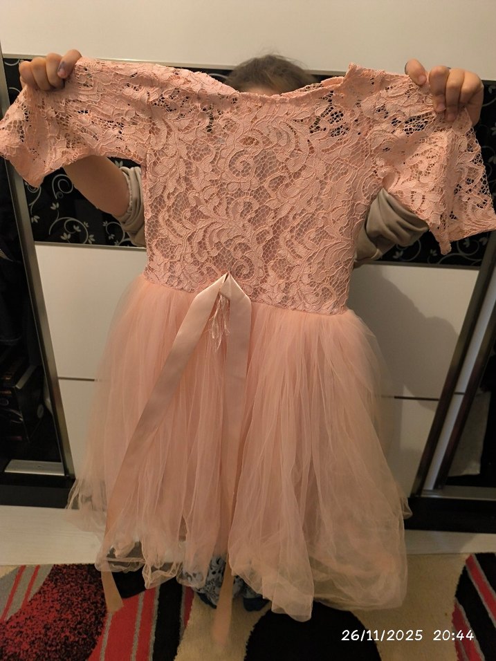 Dantel detaylı, pastel pembe renkte, baskılı desenli kız elbisesidir. Askılı ve V yakalı, dar kesimdir. MASHO Kids markasına ait, 7-9 yaş aralığına uygundur. renk tam pembe değil.