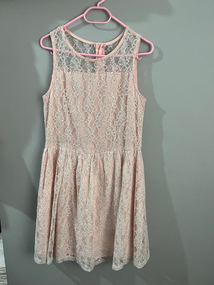 Dantel detaylı, askısız yaka ve fitted kesime sahip, pembe renk kız çocuk elbisesi. Yumuşak sentetik kumaştan üretilmiştir. 13-14 yaş için uygundur