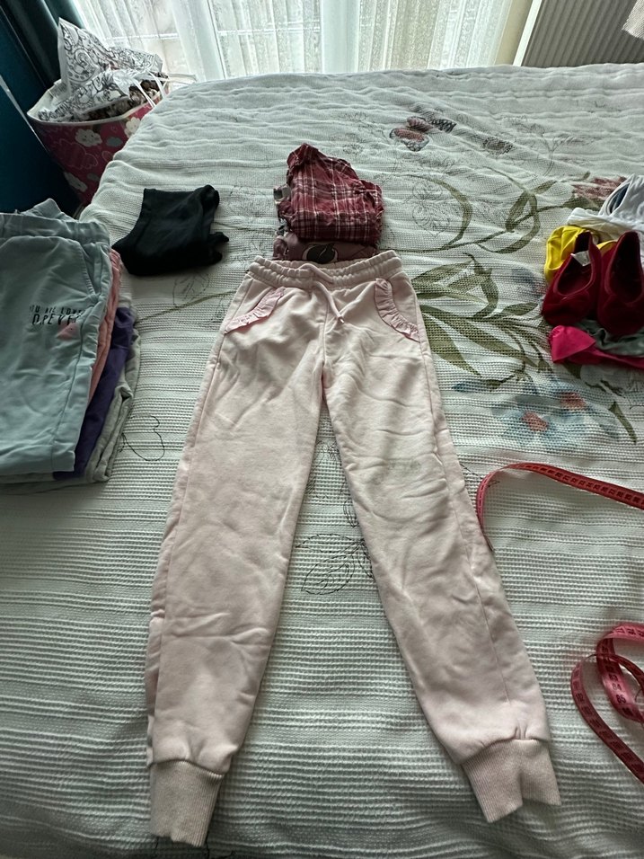 Dantel detaylı, pembe renkli, dar kesim kız eşofman altı. Yumuşak tekstil kumaştan, trend sokak stili için uygun. dizinde leke var yıkanınca çıkabilir