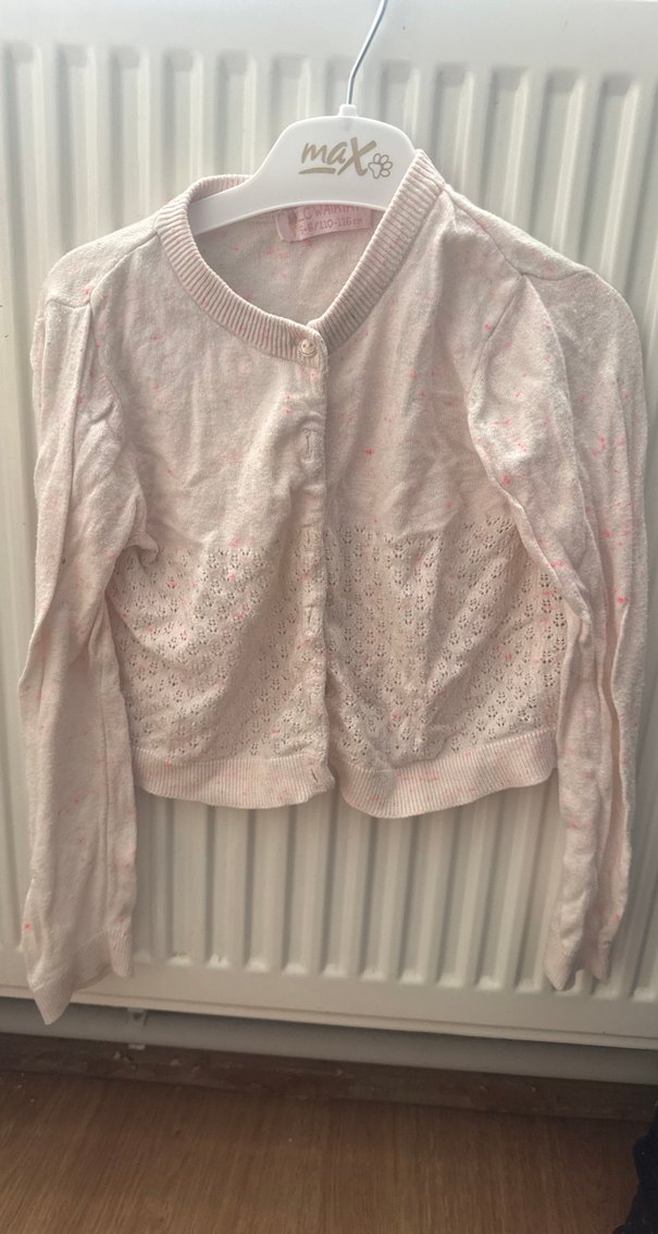 Uzun kollu, dantel detaylı, pastel pembe renkli, ince örme kumaştan yapılmış, fitted kesim kız hırkası.