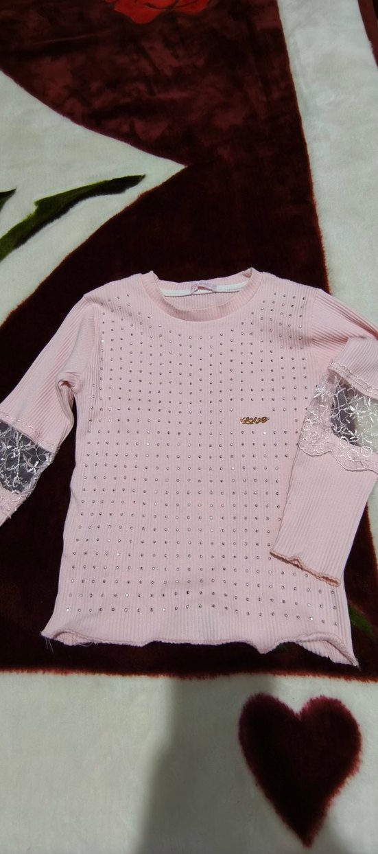 Dantel detaylı, işleme desenli, uzun kollu ve fitted kesim pembe triko kız bluz, trend sokak modasına uygun. iki kere gidi