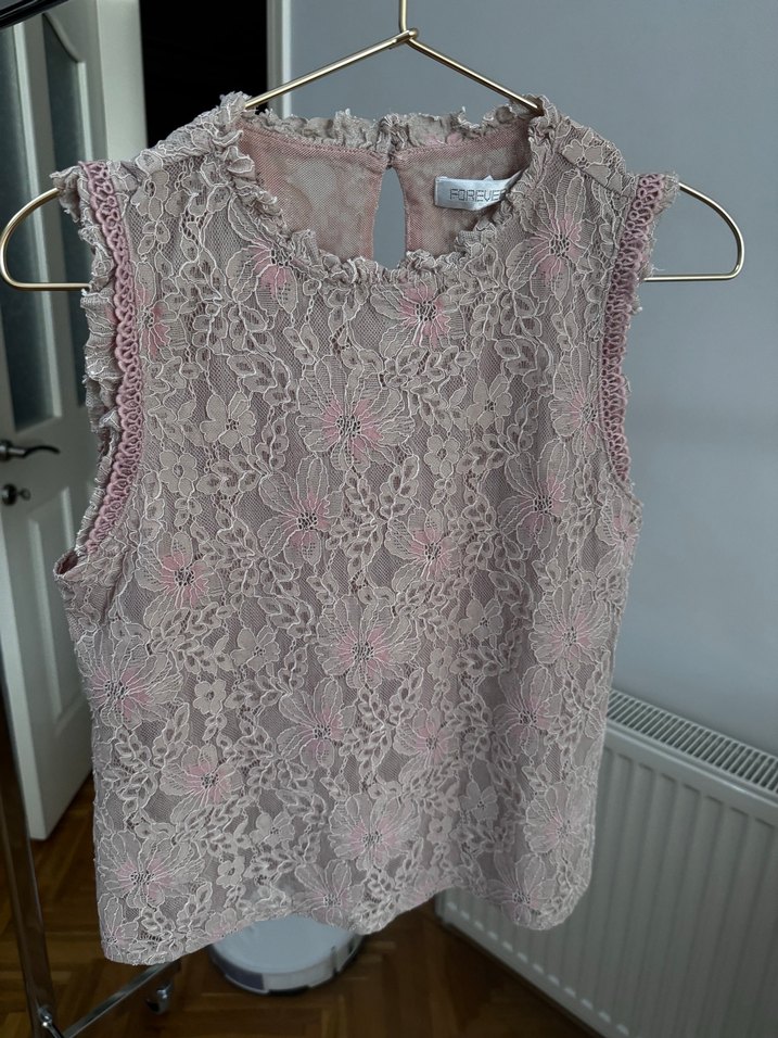 Pembe renkli, dantel işlemeli, kolsuz ve yüksek yakalı, vücuda oturan bohem tarzda bluz.