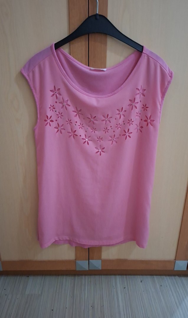 Pembe, kolsuz bluz, dantel çiçek detayları ve yuvarlak yaka ile tasarlanmıştır. Rahat kesimi ve yumuşak sentetik kumaşı günlük kullanım için uygundur.
