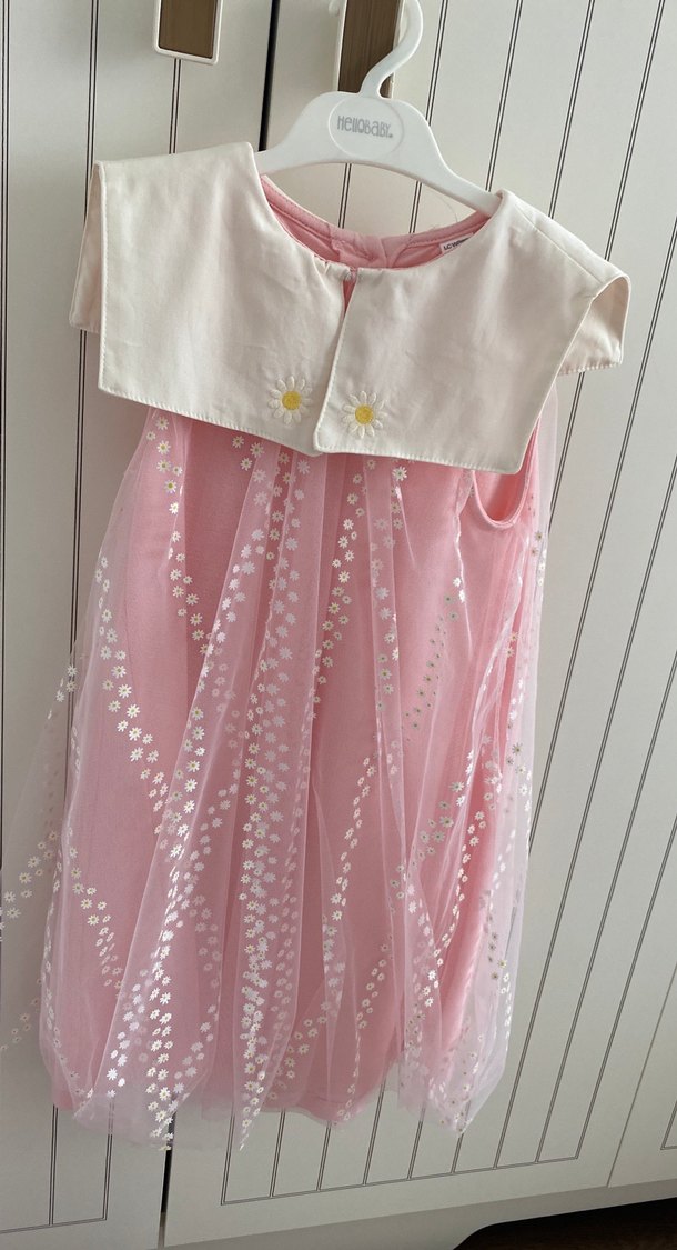 Pamuklu, dantel detaylı ve nakış işlemeli, kolsuz pembe elbise, bol kesim ve beyaz yakada papatya nakışları bulunur.