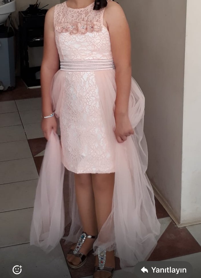 Pembe, dantelli ve straplez yakalı bu midi elbise, modern klasik tarzda, şeffaf uzun tül detayına sahip, vücuda oturan kesimlidir. 1 kere kullanıldı. kalıp olarak 4 numara yazıyor