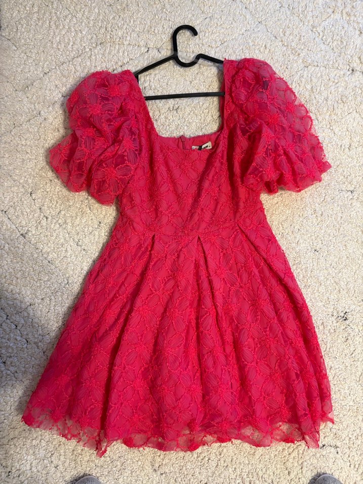Pembe renkli, renkli nakışlı dantel detaylı midi elbise. Kısa balon kol ve V yaka, bol kesim, vintage bohem tarzda.
