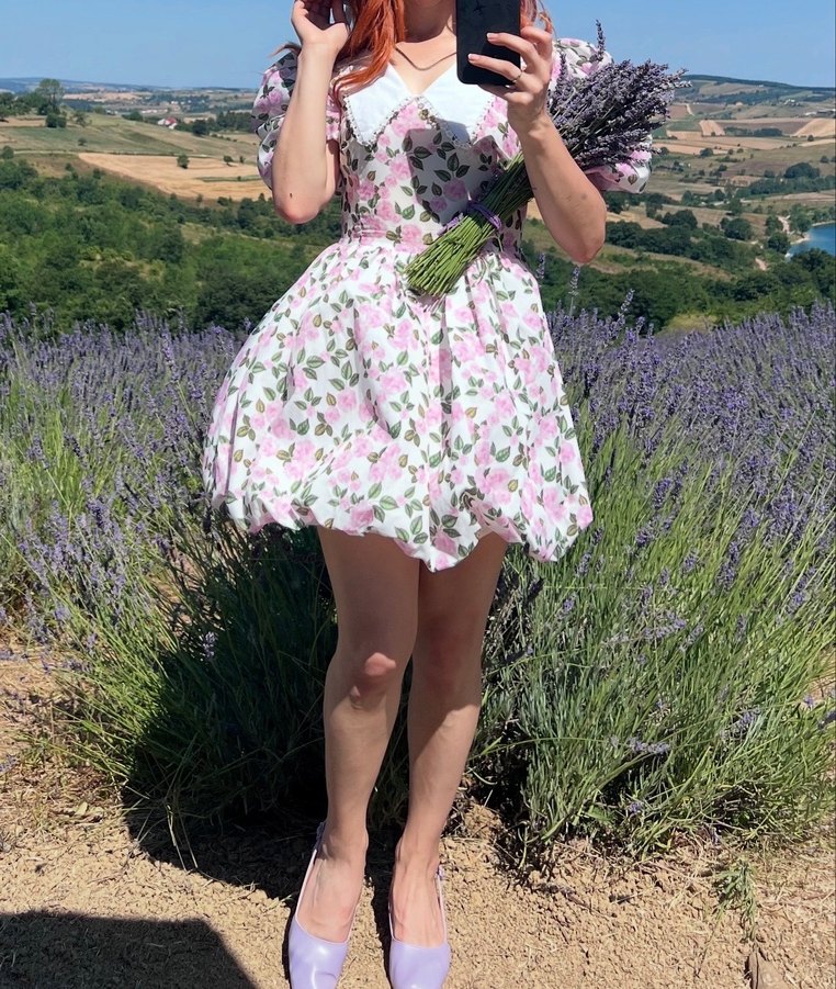 Dantel detaylı, straplez, çiçek desenli pembe midi elbise, dış mekan kullanımı için uygun, vücuda oturan kesimde.