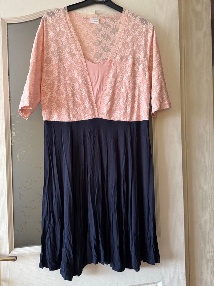 Dantel detaylı, pembe üst kısmı ve koyu renk etek kısmı olan bol kesim hamile elbisesi. V yaka ve kısa kolludur, günlük kullanıma uygundur.