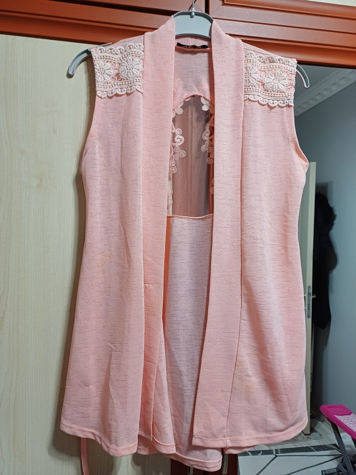 Pembe renkte, dantel detaylı omuzları olan kolsuz, midi uzunlukta ve regular kesim yelek. Yumuşak sentetik kumaştan üretilmiştir.
