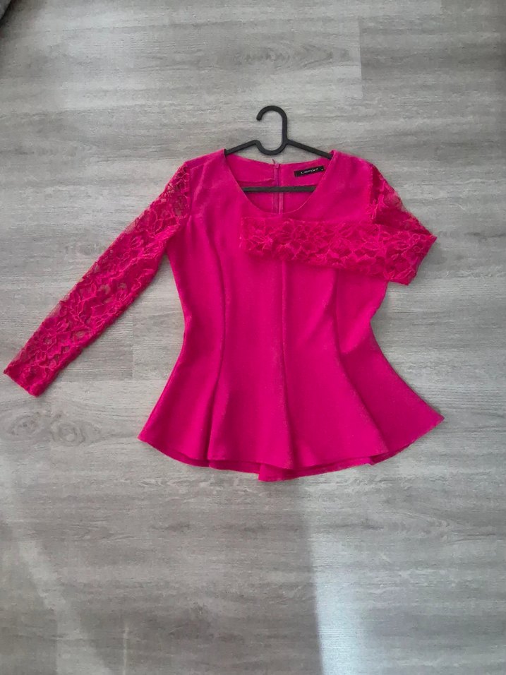 Dantel detaylı uzun kollu, V yaka ve pembe renkli kısa kesim, oturan bluz. Parlak ve iddialı görünüm sağlar.