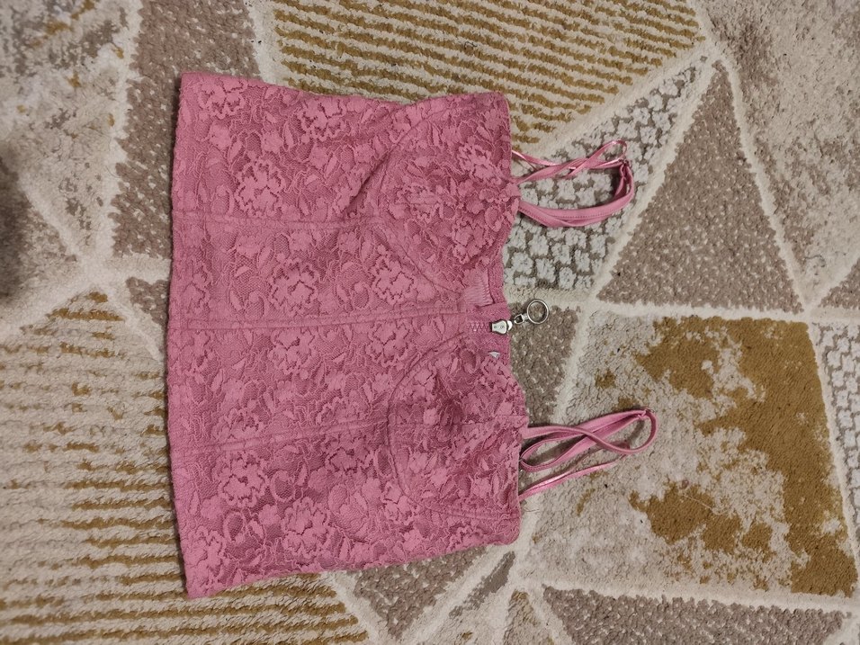 Dantel nakışlı pembe mini büstiyer, straplez yaka ve vücuda oturan kesim. Yumuşak sentetik kumaştan, kolsuz tasarım bohem tarz için uygun.