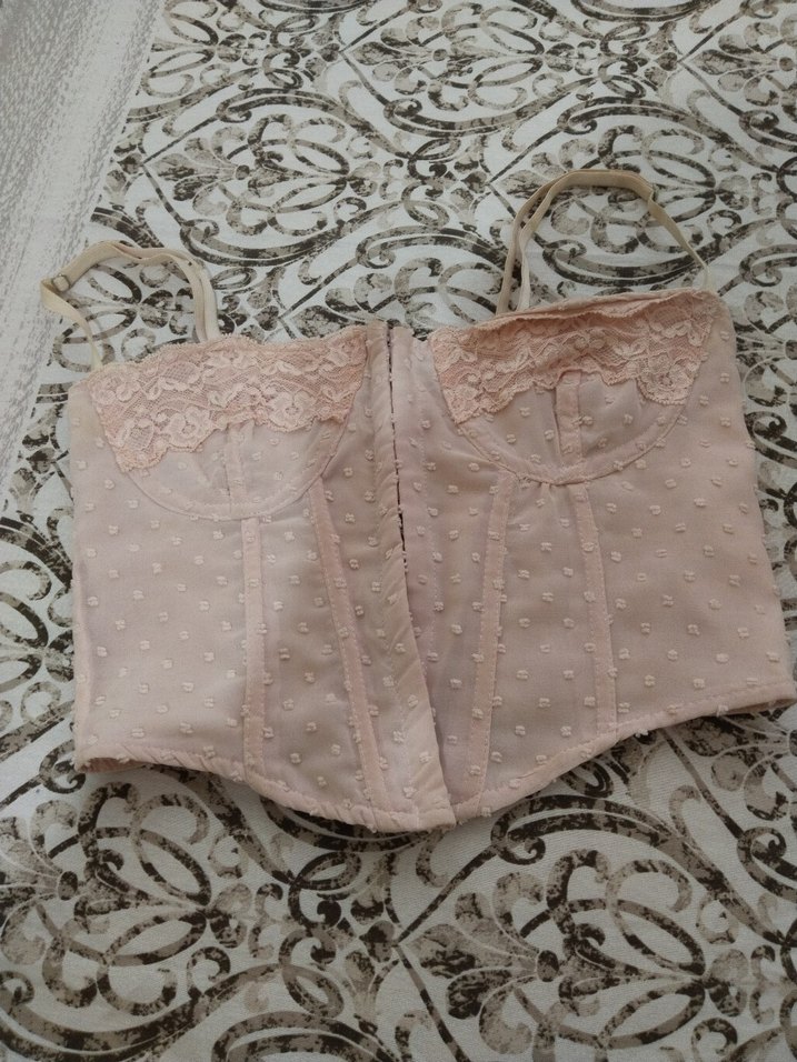 Dantel ve nakış detaylı, askılı kısa pembe mini büstiyer korse, vintage bohem tarzında ve dar kesimlidir.