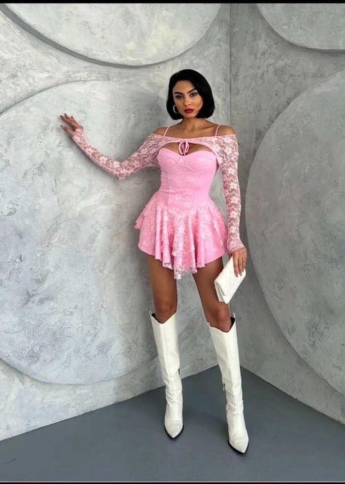 Dantel Detaylı Pembe Mini Elbise